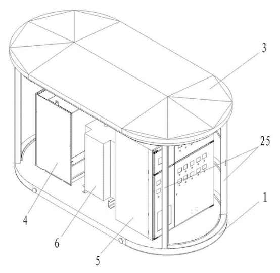 箱體外殼由材料層、龍骨與防護(hù)鋼板層三層組成,可以較好地對(duì)變電站內(nèi)的用電設(shè)備進(jìn)行較好地保護(hù);箱體外殼為橢圓柱狀,結(jié)構(gòu)更加緊密牢固。箱體外殼的前表面設(shè)置有雙開門,箱體外殼的表面均勻地設(shè)置有電纜線孔且所述電纜線孔內(nèi)貫穿有電纜線。與周圍的環(huán)境相適應(yīng),同時(shí)也提高了變電站的通風(fēng)散熱的效率。