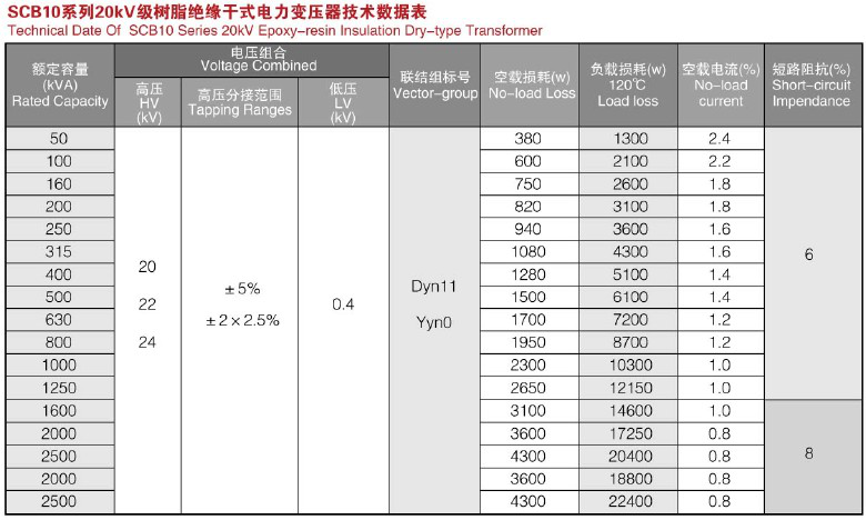 20kv級SCB10系列環(huán)氧樹脂干式變壓器技術(shù)參數(shù):