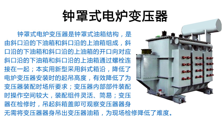 電爐變壓器斜鐘罩式油箱結(jié)構(gòu),是由斜口沿的下油箱和斜口沿的上油箱組成,斜口沿的下油箱和斜口沿的上油箱的開口向?qū)?,斜口沿的下油箱和斜口沿的上油箱通過螺栓連接在一起;本實用新型采用斜式箱沿,降低了電爐變壓器安裝時的起吊高度,有效降低了為變壓器裝配時場所要求;變壓器內(nèi)部部件裝配時操作空間較大,裝配組件靈活、簡易;變壓器在檢修時,吊起斜箱蓋即可觀察變壓器器身,無需將變壓器器身吊出變壓器油箱,為現(xiàn)場檢修降低了難度。