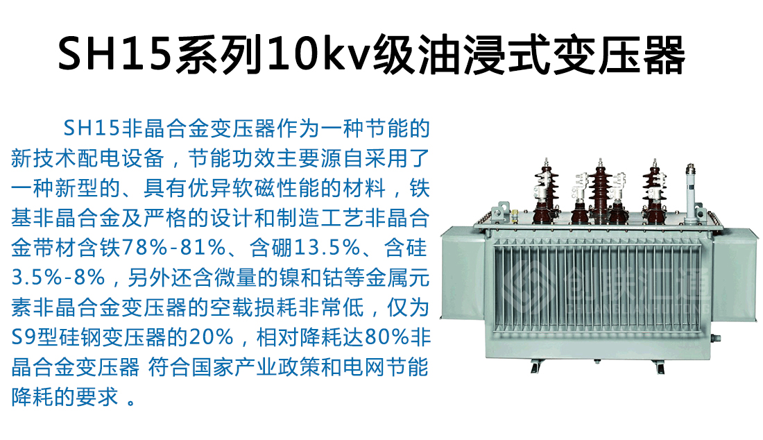 SH15非晶合金變壓器作為一種新一代節(jié)能產(chǎn)品,可以普遍適用于住宅小區(qū)、學校、工礦企事業(yè)單位以及社會公共設施??稍趹魞?nèi)(外)使用,容量在315kVA 及以下時可安裝在桿上,海拔高度不超過1000m。