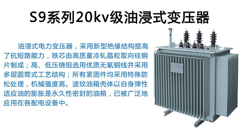S9系列20kv級油浸式變壓器為配電網絡與工礦企業(yè)供配電系統中的重要設備,在工礦企業(yè)、農業(yè)和民用建筑中廣泛使用,也可用于石油、化工行業(yè)中多油污、多化學物質的場所。使用環(huán)境:戶外/戶內使用,海拔不超過1000m。